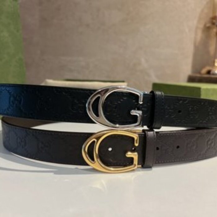 • Gucci古驰 头层牛皮压纹纹理G字金属夹扣男士35mm腰带