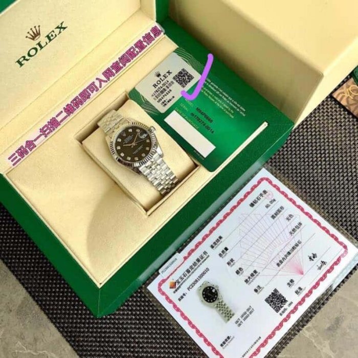 (三码合一扫描二维码即可入网查阅配置信息)劳力士Rolex女款蚝式日志型腕表!年度最火的粉色字面表盘,镶嵌10颗Vs级别天然真钻时标!每一块表都中国GTC权威机构出具的真钻证书!表盘尺寸31毫米。采用904L不锈钢18k镀金锻造,具备高抗腐蚀性。搭配劳力士定制版2236蓝游丝全自动机械机芯性能极为稳定,抗震力强、几何结构使机芯在任何位置都可保持稳定运行。三角坑纹底盖以专用工具的旋紧,使表壳完全密封,上链表冠采用双扣锁双重防水系统,牢固旋紧于表壳,使得更加防水。镜面具有耐磨性高蓝宝石材料制造,3点钟位置装有小窗凸透镜(2.5倍)女装日志型的防水蚝式表壳给予高精准机芯最佳防护!904L腕表表带和外圈底下的崭新双头粒连接方式,隐蔽式摺叠皇冠带扣,以铰接的劳力士皇冠标志开启。6字位内影圈以腐蚀工艺一表一码。绝不重复。认准独家品质