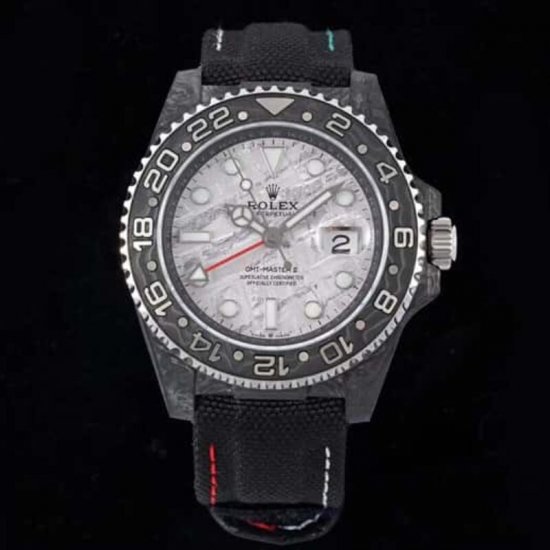Diw为GMT-Master II重新制作了碳纤维表壳,同时包含表圈、面盘等零件也全都是碳纤维材质,除了有碳纤维独特的不规则纹理之外,其中碳纤维表圈上数字刻度首次采用全新碳纤维植丁技术(非填油)塑造丰富视觉层次,质感细腻。